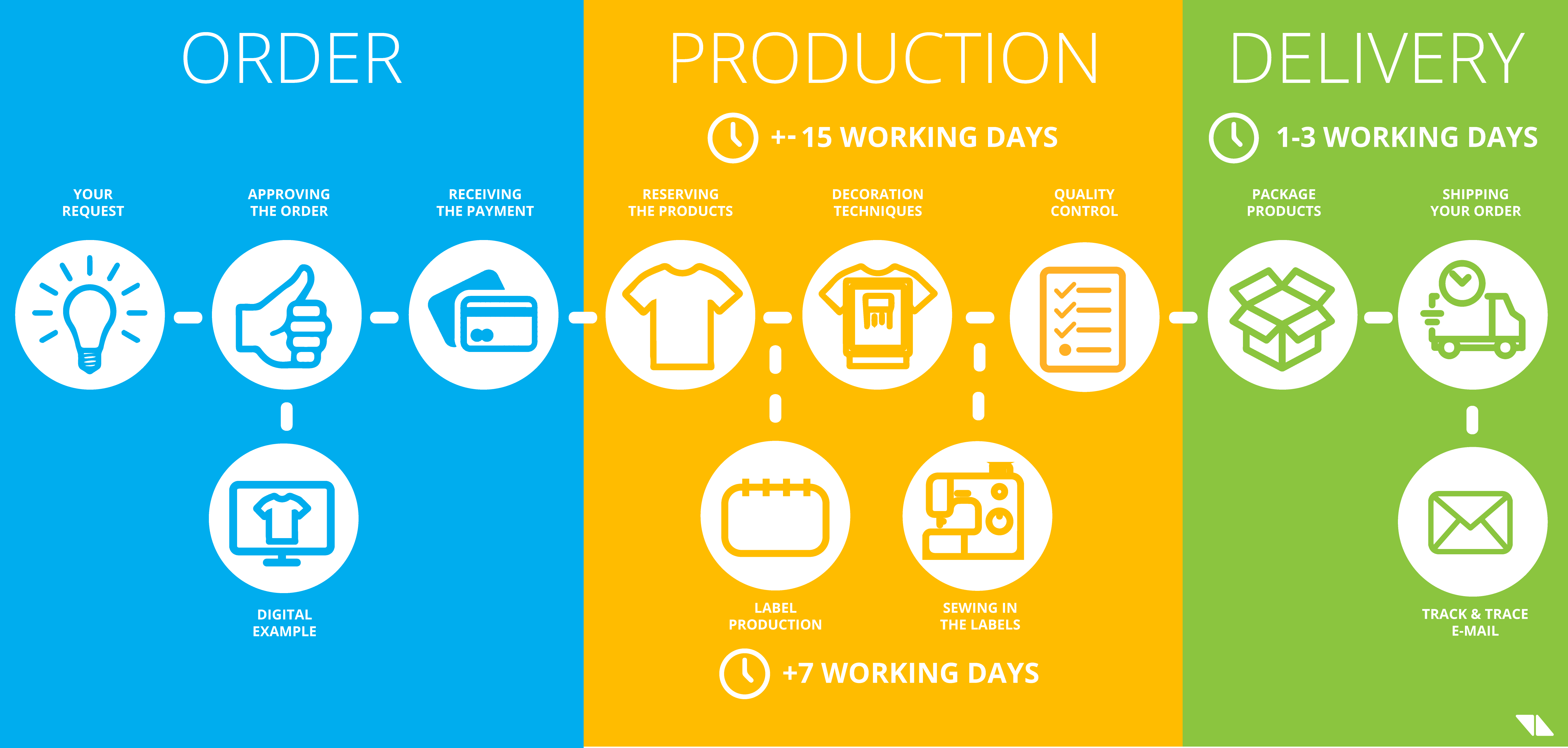 The account manager needs practical information for your order, the product(s) you’re interested in, the color(s), and your design preferably in a good format, for example in vector format. The graphic designer examines your design and advise you which decoration technique will be the best for your order. Our standard production time is about 15 working days. If you ordered textile with labeling, the production time is about 20 working days. The production time with labeling takes 5 working days more as the labels have to be produced and sewed in. Don’t forget to mention your deadline if you have one in mind. We think it is very important to deliver your order on time. On this page, we give you an overview of which information we need to process your request efficiently. We value personal contact and we want to listen attentively to your ideas. In this way, we can become long-term partners.